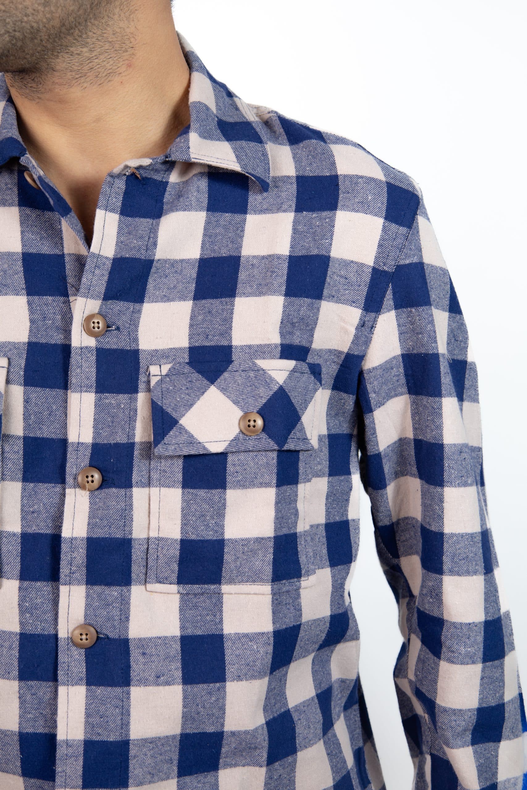 azul, beige, camisa m. larga, cuadro grande, ropa de caballero