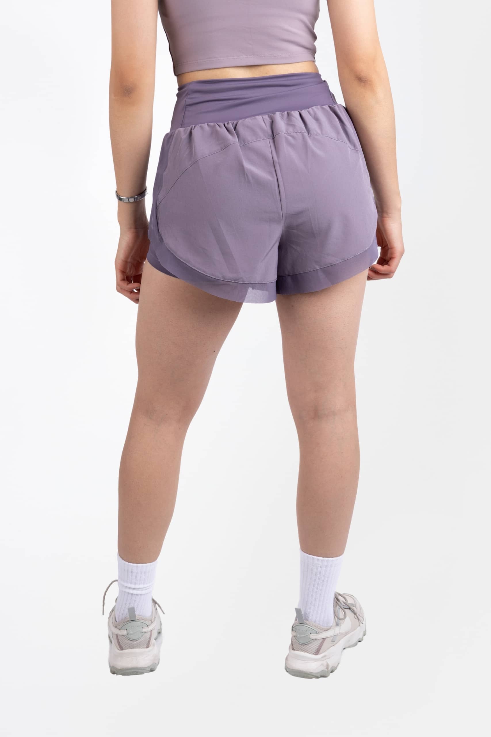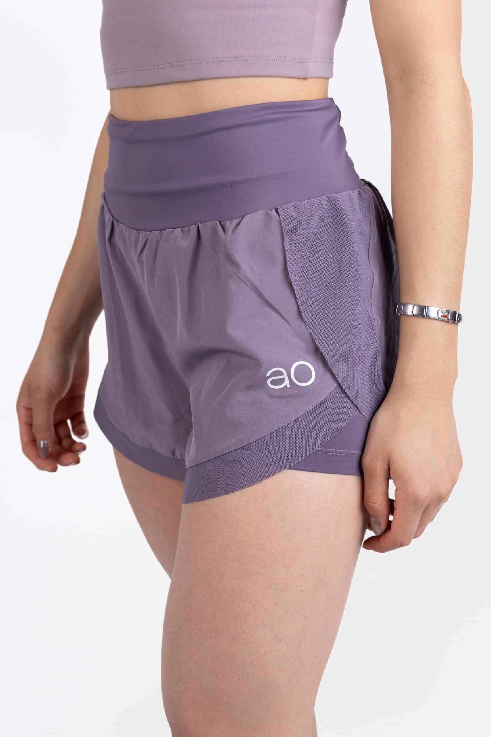 Short corto deportivo morado con malla , pretina ancha 87% nylon/13% elastano