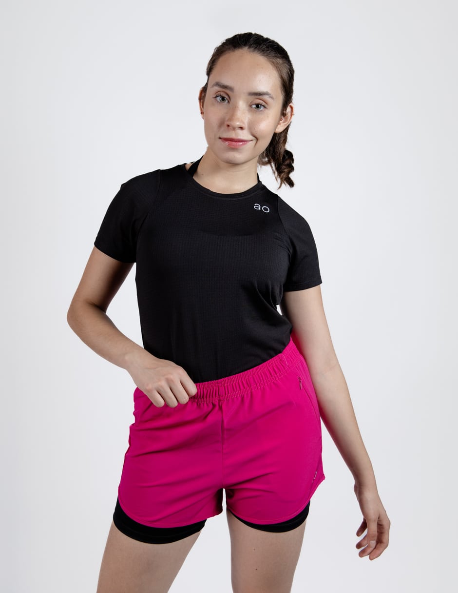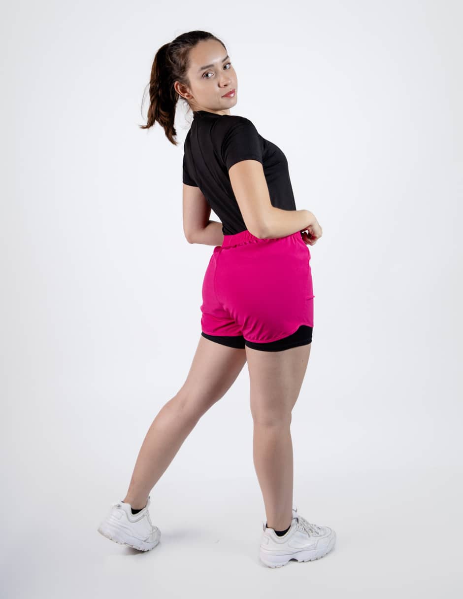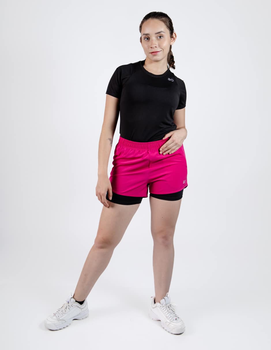 short fushia para dama con lycra negra , cierre oculto en costado izquierdo, elastico en cintura y transfer logo ao en pierna izquierda